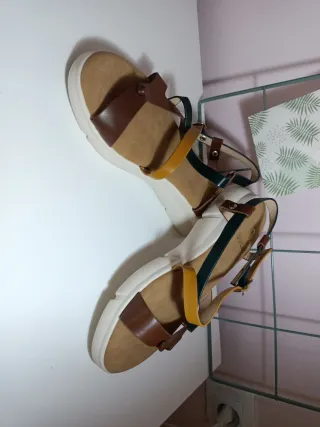 Sandalias de plataforma con un diseño moderno y llamativo. - Tiras en marrón, verde y amarillo. - Suela blanca de plataforma. - Cierre con hebilla.
