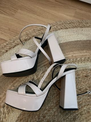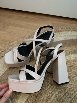 Tacones de plataforma en color beige. - Diseño con tiras cruzadas. - Tacón grueso y alto. - Punta cuadrada. usada una vez