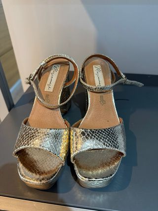 Sandalias de tacón de plataforma en color plata. Son ideales para cualquier ocasión especial. - Tienen un diseño elegante y sofisticado. - Son de material brillante. - Están en buen estado, aunque presentan algunas señales de uso.