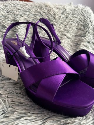 Preciosas sandalias de tacón nuevas a estrenar de la marca Zara. Talla 39. De raso morado con tacon y plataformas . Tiene plantilla visco confort. Ideales para celebraciones. Muy bonitas.