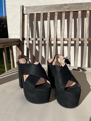 Sandalias negras con plataforma. Usadas una noche , están nuevas. No pesan , muy cómodas. - Correa ajustable con hebilla en el tobillo. - Suela gruesa con relieve.