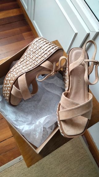 Sandalias de plataforma, utilizadas solo una vez. - Cierre de correa con hebilla. - Plataforma forrada de esparto. Yo uso una 38 pero en este caso tallan justo y por eso compré una talla más. Se entrega en mano (Burgos).