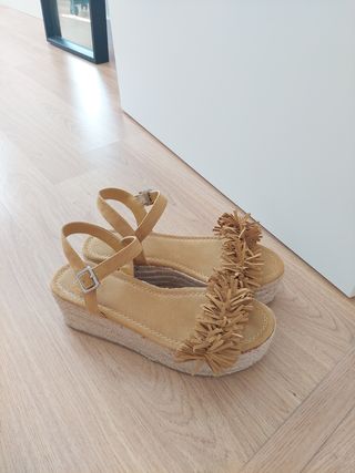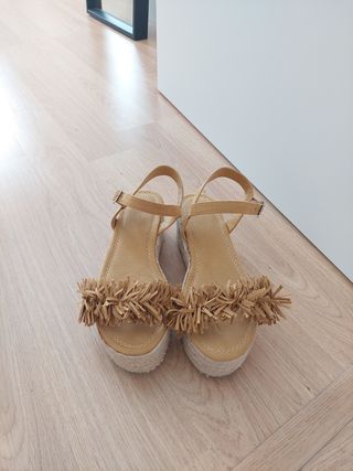 Sandalias de plataforma de la marca Pull&Bear en color mostaza. Están prácticamente nuevas. - Diseño con tiras cruzadas en la pala. - Cierre con hebilla en la tira del tobillo. - Plataforma forrada de esparto.