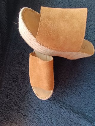 Sandalias de estilo Birkenstock con plataforma. - Diseño de dos tiras con hebillas. - Plataforma con acabado de esparto. - El tejido es muy blandito (tipo ante) y no rozan nada. - Han sido usadas pero están bien, aunque tienen la suela sucia.