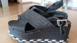 Sandalias negras de plataforma, talla 39. Están puestos solo una tarde - Suela y tacón imitación esparto - Diseño de tiras. - Tacón de plataforma cómodo.