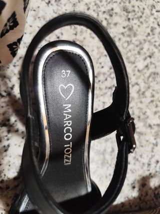 Sandalias de plataforma de la marca Marco Tozzi, talla 37. Son de color negro y tienen una cuña de corcho con un diseño elegante. Ideales para el verano. - Cuña de corcho con estampado. - Hebilla de cierre en el tobillo. - Diseño elegante y cómodo.