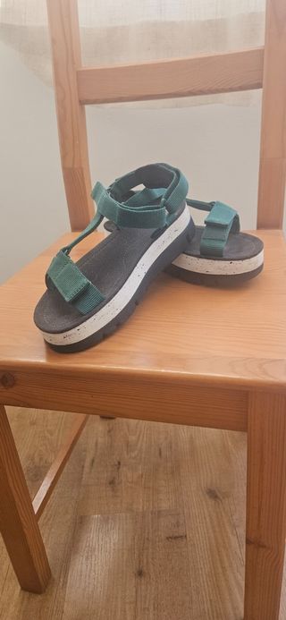 Sandalias Camper talla 39, color verde. Son unas sandalias bonitas y estan en buen estado. Han sido usadas un par de veces. Nuevas costaron 70€. - Plataforma cómoda. - Diseño moderno. - Perfectas para el verano.