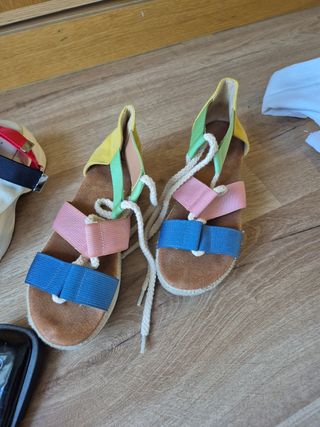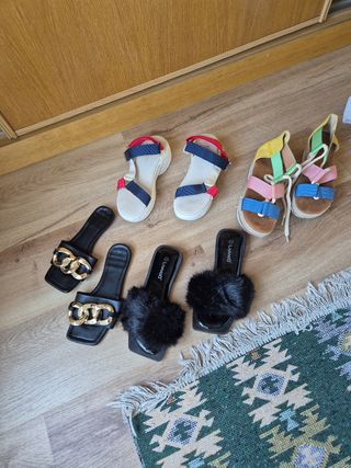 Vendo cuatro pares de sandalias. Dos son negras con cadena dorada, otras dos son de plataforma con tiras de colores. Las sandalias negras son elegantes y modernas. Las de plataforma son coloridas y juveniles. - Dos pares de sandalias planas negras con detalle de cadena dorada. - Dos pares de sandalias de plataforma con tiras de colores.
