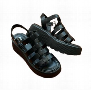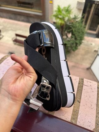Sandalias de plataforma con un diseño moderno y cómodo. Se compraron antes de la operación decalcáneo por lo que se usaron un par de veces, tras la operación no me puedo poner este tipo de zapatos. Compradas por 79,99€. - Tiras cruzadas con hebilla ajustable. - Suela gruesa con detalles blancos. - Logo de la marca en la plantilla.