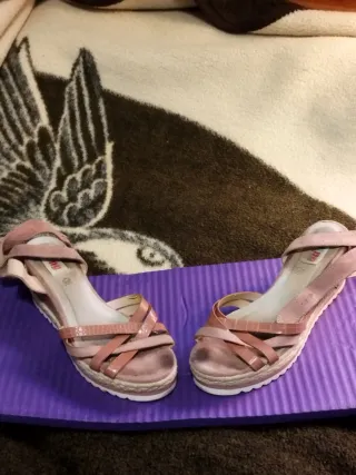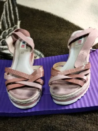 Sandalias marrones con plataforma de esparto marca Bershka talla 37, pero son para un pie 38, compré un treinta y siete porque el tallaje era grande. Viendo más calzado en mi perfil.