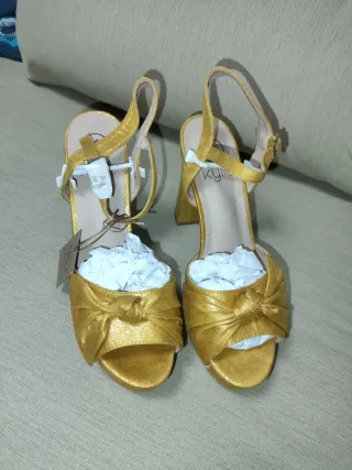 Elegantes sandalias de fiesta con un llamativo acabado dorado. Perfectas para cualquier celebración. - Diseño de tiras cruzadas. - Plataforma delantera. - Tacón grueso y estable. - Cierre de hebilla en el tobillo. Tallas a elegir :36,37,40 y 41