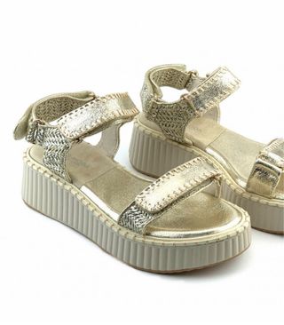 Sandalias cómodas con plataforma. - Diseño en color dorado. - Cierre de velcro. - Tira frontal y de tobillo. - Suela gruesa con textura. - 5cm trasera y 3cm delantera PRECIO EN TIENA FISICA: 34€ NUEVO A ESTRENAR CON SU CAJA Y ETIQUETAS DE FABRICA LIQUIDACION STOCK ALMACENES.