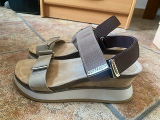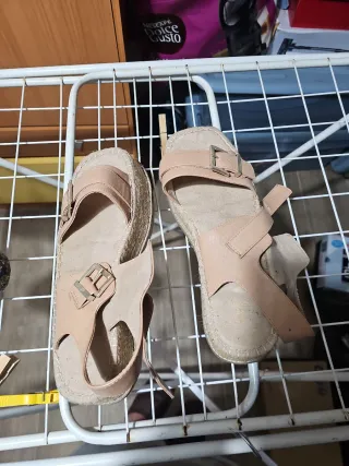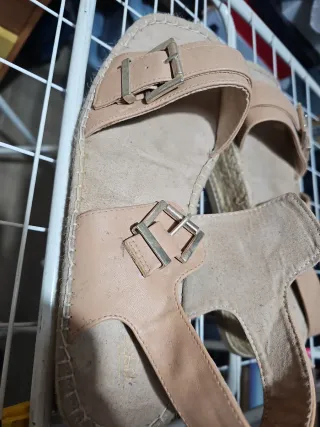 Sandalias de plataforma con cuña y tiras. - Diseño con textura de piedra. - Cierre con hebillas doradas. no puedo hacer la devolución porque se me pasó el plazo pero está nuevo