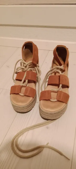 Sandalias Mustang con plataforma en color arena y detalles en marrón. - Cierre de hebilla. - Suela de esparto. - Con caja original. Puestas una vez
