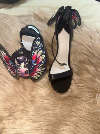 Elegantes sandalias de tacón con un llamativo diseño de mariposa. - Detalle de alas de mariposa en la parte trasera. - Tira fina en el tobillo con cierre de hebilla. - Sin estrenar - Perfecto Estado
