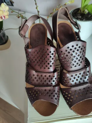 Sandalias de mujer con un diseño abierto y detalles troquelados. Está hecho en España, marca Pilar Monet Pone que es talla 40, pero van para 39, la plantilla mide 25,5cm - Tacón de bloque de 10 cm. - Cierre con hebilla. - Material de cuero. Estado muy bueno Envío en 24 horas