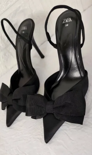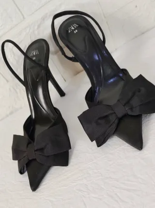 Elegantes sandalias de tacón de Zara con un diseño moderno. - Combinación de colores blanco y negro. - Tiras finas y detalle de lazo en la puntera. - Tacón de cuña.