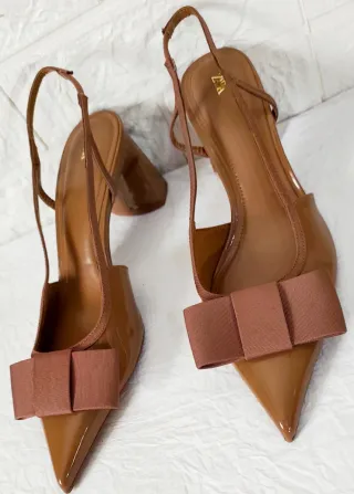 Elegantes sandalias de tacón con un detalle de lazo en la punta. - Diseño de punta fina. - Tacón grueso y escultural. - Tira fina en el tobillo. - Acabado brillante.
