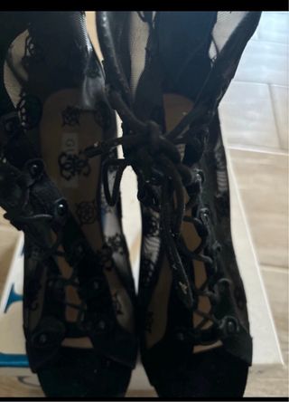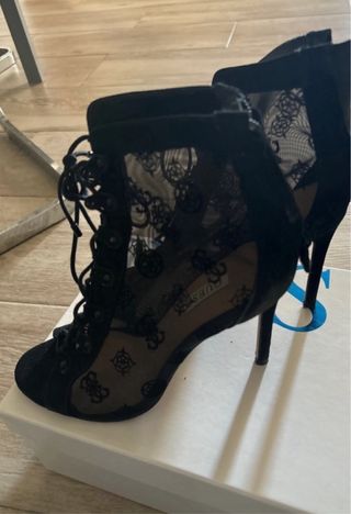 Elegantes tacones Guess de color negro con un diseño de encaje. - Tacones de aguja. - Cierre de cordones. - Detalle de encaje floral. - Logo de Guess visible en la plantilla.