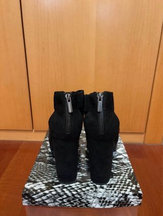 Sandalias tacon en color negro, perfectos para ocasiones elegantes o salidas nocturnas.Estilo/corte: Abiertos, tacón de aguja alto (aprox. 10 cm).Detalles: Correa ajustable al tobillo con hebilla, diseño peep-toe.Material: Ante negro suave.Talla: 38 Medidas aprox.: Largo plantilla 25 cm, tacón 10 cm.Estado: Muy buen estado, usado pocas veces, suela con marcas leves de uso pero sin rotos ni manchas graves #zapatos #tacones #negros #ante #shoes #heels #black #suede #chaussures #talons #noir #daim