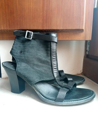 sandalia de tacon de 9 cm de alto,imitación piel de serpiente.La talla es 36 pero va bien para la 37.Puesta suela y tacon antes de estrenar,tienen un solo uso.Hechas en España.