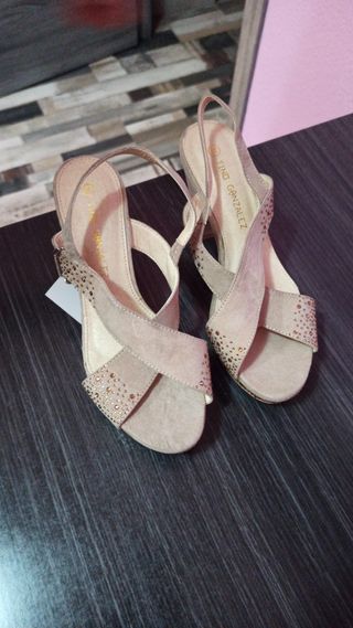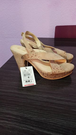 Sandalias de tacón talla 38,TINO MARTINEZ,sin estrenar ,color beis con detalles brillantes dorados en laterales de suela y parte superior.sin estrenar,con etiqueta pero sin caja,costaron el doble del precio del anuncio. No negociable.