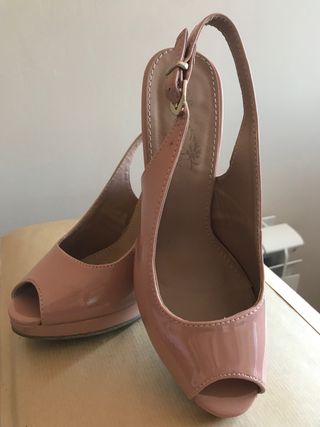 Elegantes zapatos de tacón con un diseño de tiras cruzadas y plataforma. - Tacón de aguja alto. - Cierre de cremallera en el talón. - Material tipo ante. Muy cómodas al sujetar el pie en punta, empeine y talón. Solo un uso. Se venden por mudanza.