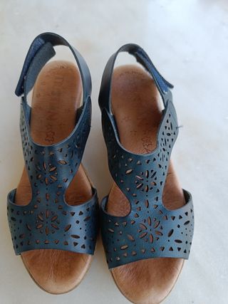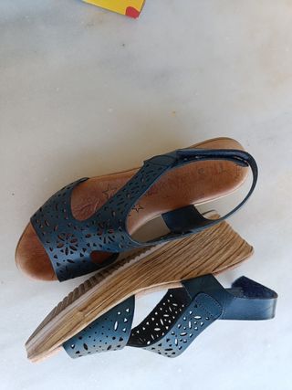 Sandalias de piel con cuña. Color azul marino. Cómodas. Ajuste con velcro. Poco uso por utilizar ahora tacón más ancho. Abstenerse gente no interesada y que no compra, ni contesta.