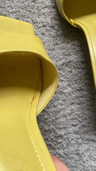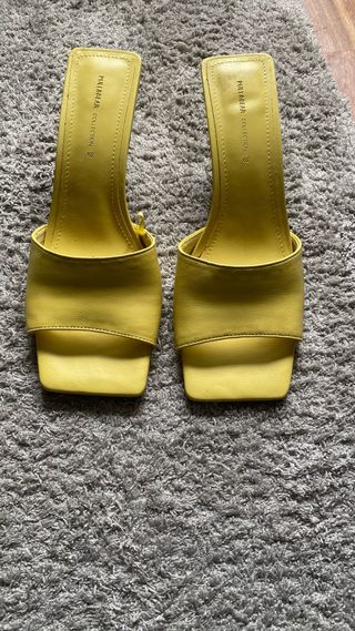 sandalias de tacón bajo de la marca Pull&Bear. Son de color amarillo y están s estrenar. La marca interna es de pegamento, no se ve, pero venían asi