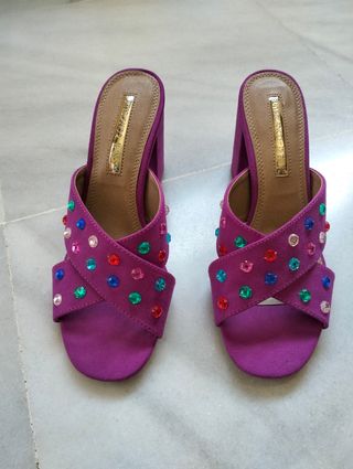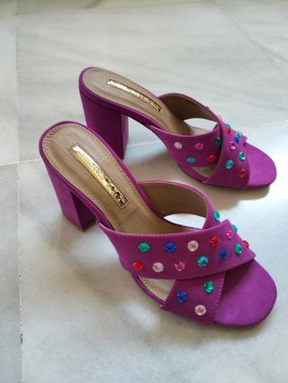Elegantes tacones blancos, perfectos para un día especial. - Diseño abierto en la punta. - Tira frontal con detalle de brillantes plateados. - Cierre de hebilla en el tobillo.