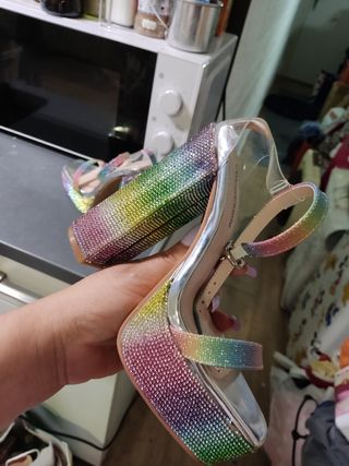 Sandalias de tacón alto con un diseño llamativo y lleno de color. Perfectas para destacar en cualquier ocasión. - Pedrería brillante en forma de arcoíris. - Tiras finas y tobillera con cierre de hebilla. - Plataforma delantera para mayor comodidad. - Tacón grueso y alto.