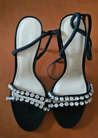Elegantes sandalias de tacón de Zara con un diseño llamativo. - Tiras adornadas con pedrería. - Tacón alto y fino. - Cierre de cremallera en la parte trasera.