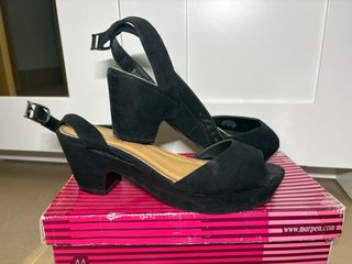 Tacones negros de la marca marypaz con diseño descubierto. - Plataforma delantera. - Tira trasera con hebilla. - Tacón grueso.