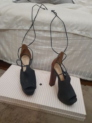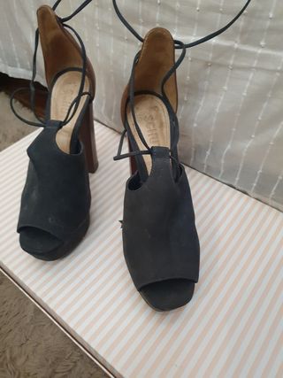 Preciosas sandalias de tacón alto, color negro. Tienen plataforma. Ante y tacòn madera. Tienen un diseño elegante y sofisticado. - Tacón de madera 14cm. - Tiras para star a la pierna que miden 73cm de largo. - Plataforma 4 1/2 cm.