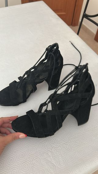 Elegantes sandalias negras con un diseño de tiras y cordones. Zapato negro, talla 38, de la marca Bershka.