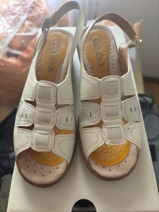 Sandalias de tacón medio de la marca Dospidnik. - Diseño abierto en la punta. - Tira trasera ajustable con hebilla. - Detalle de tiras cruzadas en el empeine. - Plantilla con acolchado amarillo.