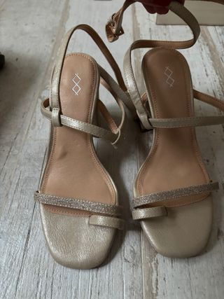 Elegantes sandalias de tacón bloque en color dorado. Perfectas para añadir un toque de brillo a cualquier atuendo. Ideales para estas Navidades. Son de calidad,hechas en España. - Diseño de tiras. - Tacón grueso y estable. - Punta cuadrada. Usadas una vez. Se recogen en Collblanc.