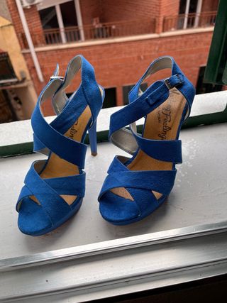 Elegantes sandalias de tacón alto con un vibrante color azul. - Diseño de tiras cruzadas. - Cierre de hebilla. - Material tipo ante.