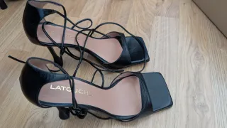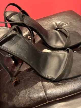 Elegantes tacones negros con diseño de tiras. - Material: Ante. - Tacón fino. - Cierre de tiras al tobillo.