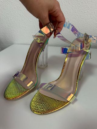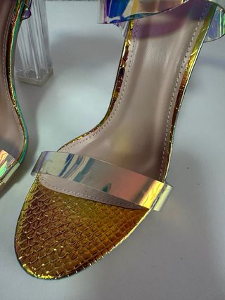 Sandalias de tacón con un diseño llamativo y moderno. - Tacón grueso y transparente. - Tiras transparentes con efecto iridiscente. - Detalle de escamas en la puntera. - Cierre de hebilla.