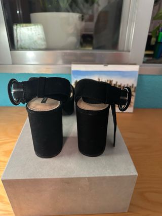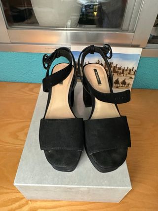 Sandalias de tacón negras de Pull&Bear. - Diseño con plataforma. - Tira al tobillo con hebilla. - Material efecto ante.