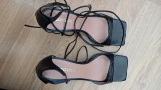 Sandalias de tacón con un diseño moderno y elegante. - Tiras ajustables con hebilla dorada. - Detalle de tachuelas doradas en la plataforma. - Tacón ancho tipo cuña. Las compré por 35 euros para una ocasión especial y el evento se anuló. Las sandalias están sin usar y aunque me encantan nunca sé con qué ponérmrlas porque no son mi estilo de diario. Espero que alguien les saque provecho.