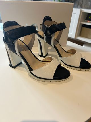 Elegantes tacones de la marca Lodi. - Diseño bicolor en blanco y negro. - Tira ajustable en el tobillo. - Tacón grueso y plataforma.