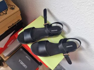 Sandalias Marlene Prieto de mujer, color negro,de piel. Son elegantes y cómodas, ideales para cualquier ocasión. - Tacón de madera(aproximadamente 3cm) - Diseño de tiras. - Hechas en España.. Puedo enviar por InPost (wallapop).