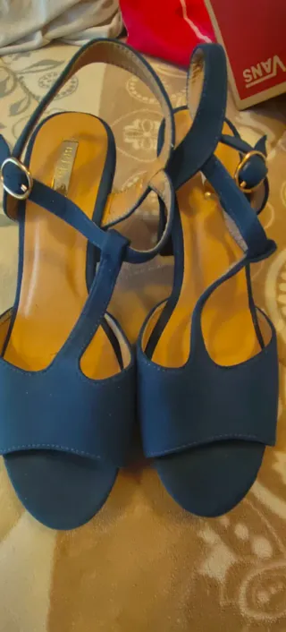 Sandalias de tacón alto de la marca Bershka. Son de color azul marino y naranja. - Tacón alto y plataforma. - Diseño de tiras cruzadas. - Material tipo ante.