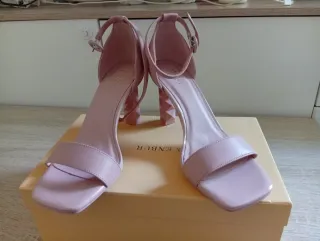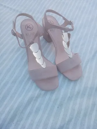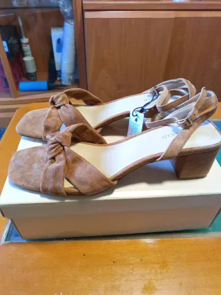 Sandalias de tacón con diseño elegante. - Material: ante. - Cierre de hebilla en el tobillo. - Tacón bajo cuadrado. - Sin estrenar, con caja y etiquetas. - Precio original 44,99€