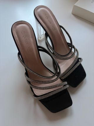 Sandalias de tacón con tiras transparentes. - Tacón cuadrado transparente. - Diseño de tiras cruzadas. - Punta cuadrada.