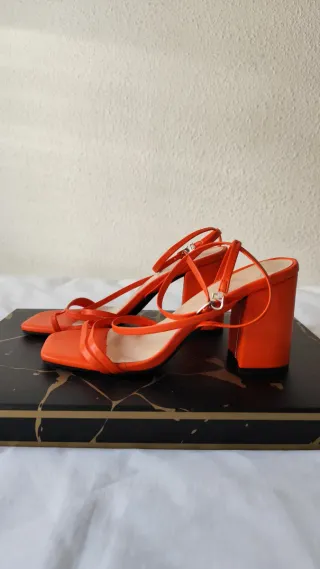 Elegantes sandalias de tacón en color naranja. - Diseño con tiras finas. - Tacón cuadrado (aprox 9cm). - Cierre de hebilla en el tobillo. - Tallan algo más grande, como un 37.