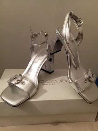 Elegantes sandalias plateadas con un diseño de tiras cruzadas. - Tira ancha en el talón. - Tacón cuadrado y robusto. - Diseño abierto en la punta. - Tacón 10,5 cm Solo se han usado en una ocasión.