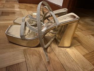 Elegantes sandalias de tacón alto y cómodas plataforma con un acabado brillante dorado. Prácticamente nuevos, usado un único día. - Diseño de tiras. - Plataforma delantera. - Correa al tobillo con cierre de hebilla. - Tacón grueso y cuadrado.